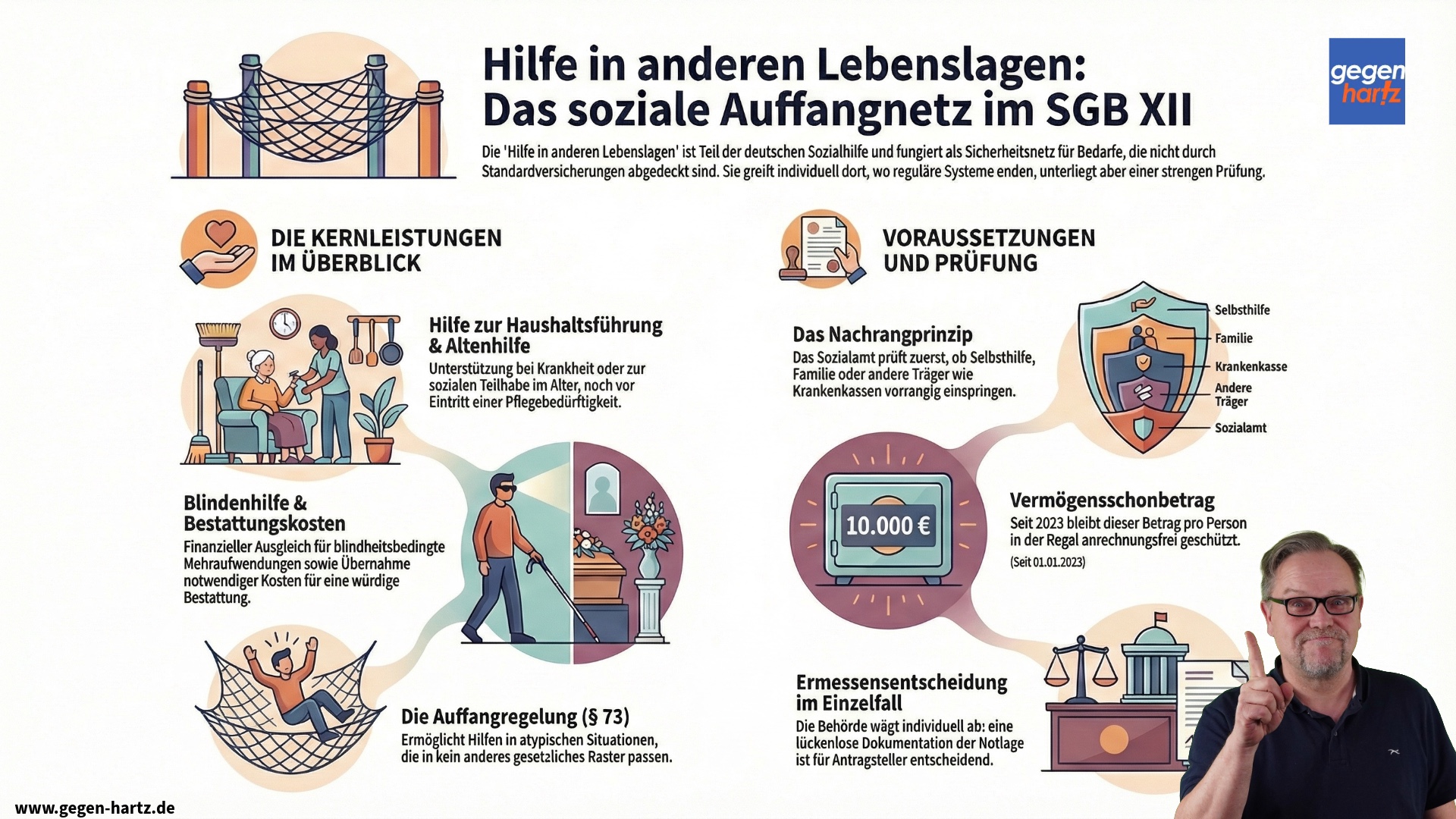 Die „Hilfe in anderen Lebenslagen“ wirkt auf den ersten Blick wie ein Randbereich des Sozialrechts. Tatsächlich zeigt sie, wie ein Sozialstaat mit den Zwischenräumen umgeht. Nicht jede Krise ist planbar, nicht jede Biografie passt in Standardleistungen. Dass es für Haushaltsabbrüche durch Krankheit, für altersbedingte Hürden ohne Pflegegrad, für blindheitsbedingte Mehrkosten, für unzumutbare Bestattungslasten und für atypische Sonderfälle eigene Regelungen gibt, ist Ausdruck eines Systems, das auch dort handlungsfähig bleiben will, wo Regelkataloge an Grenzen stoßen.