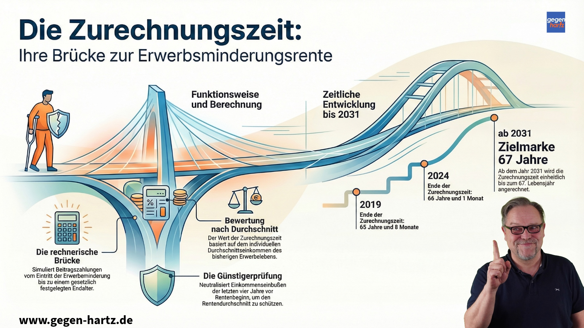 Die Zurechnungszeit ist eine rechnerische Brücke zwischen dem Eintritt der Erwerbsminderung und einem gesetzlich festgelegten Endalter. Sie schützt Erwerbsgeminderte davor, dass ihre Rente allein wegen fehlender Beitragsjahre massiv absackt.
